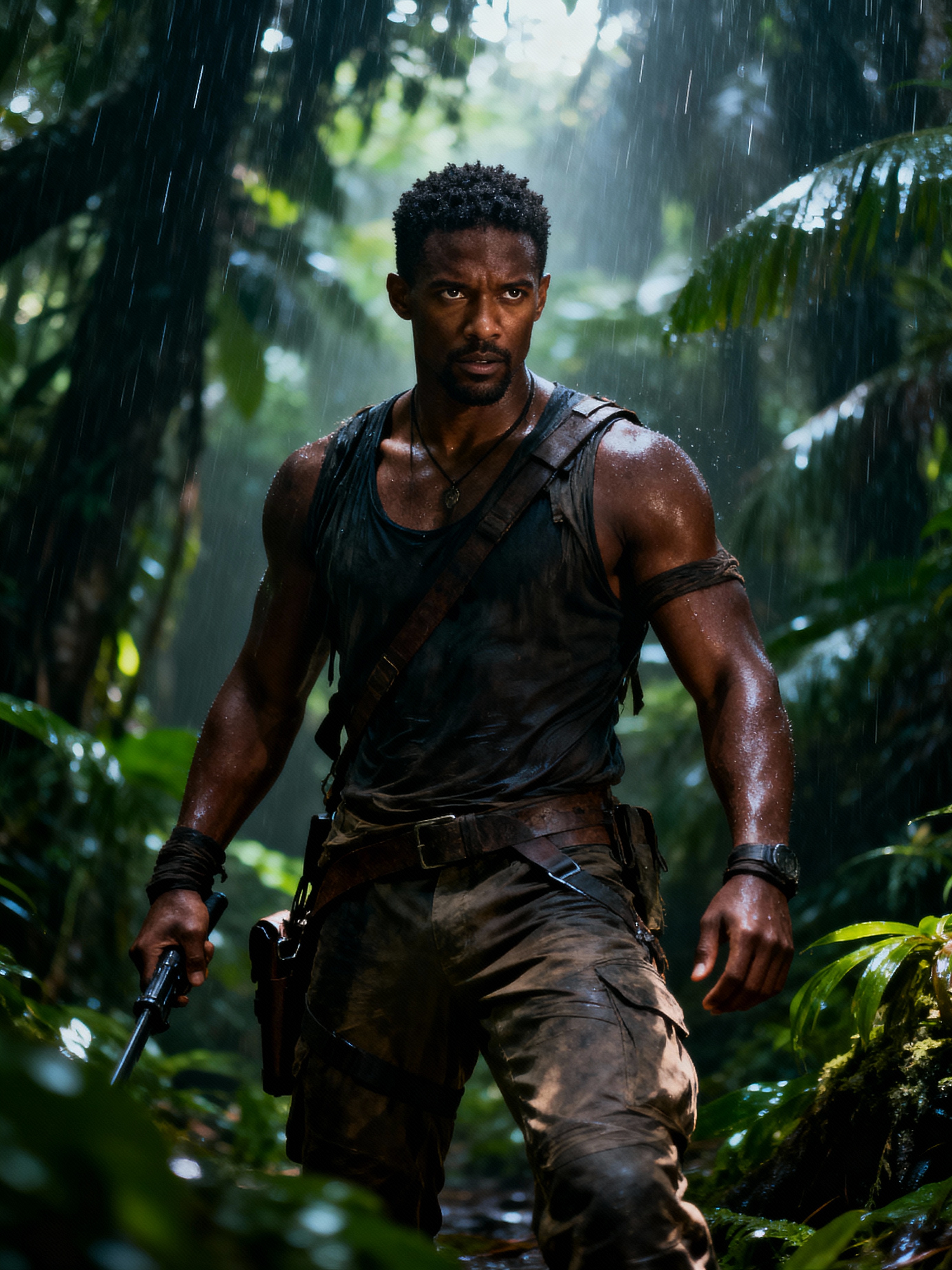 model as masculine male sidekick of Lara Croft in Tombraider, in rainforest, cinematic lighting