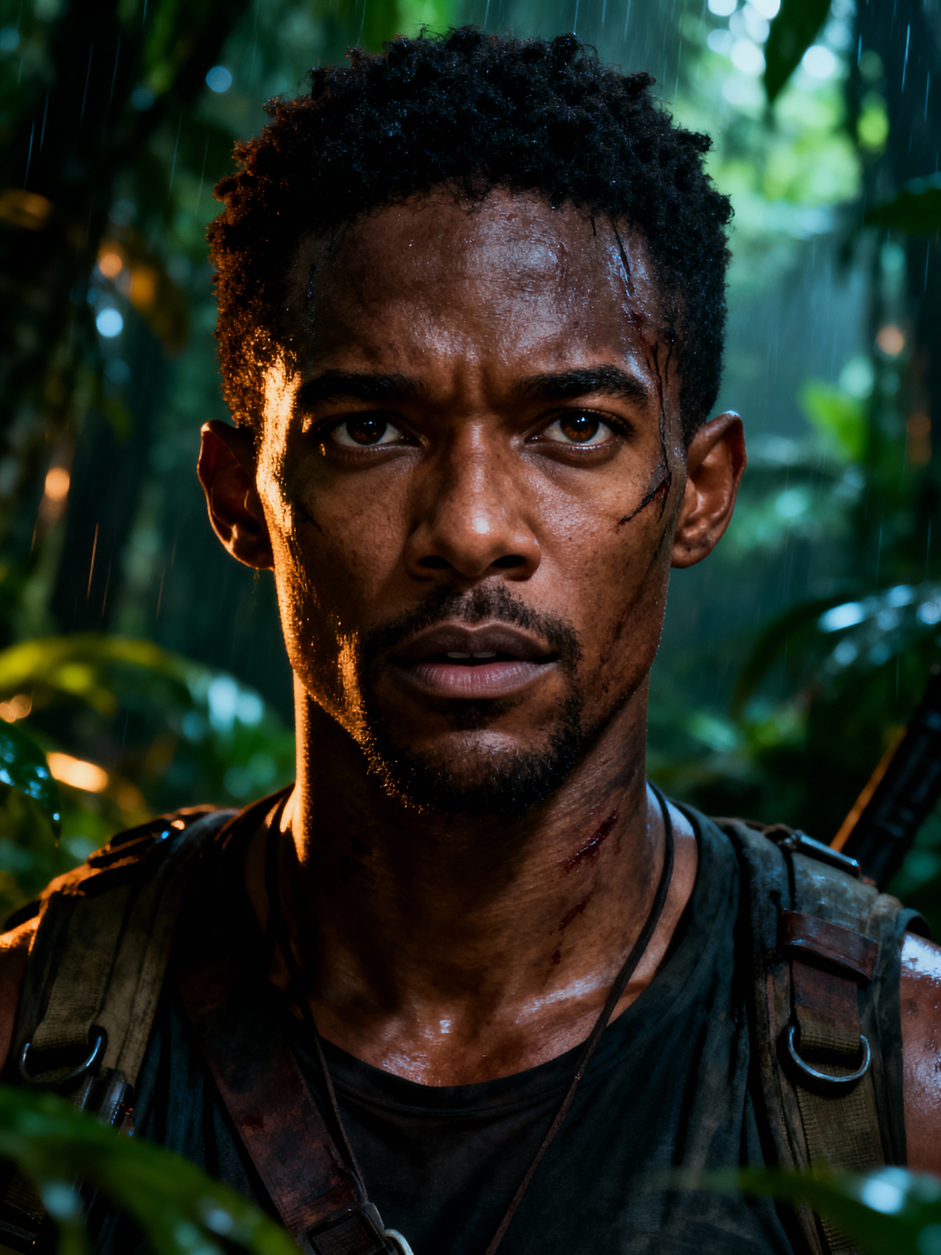 model as masculine male sidekick of Lara Croft in Tombraider, in rainforest, cinematic lighting