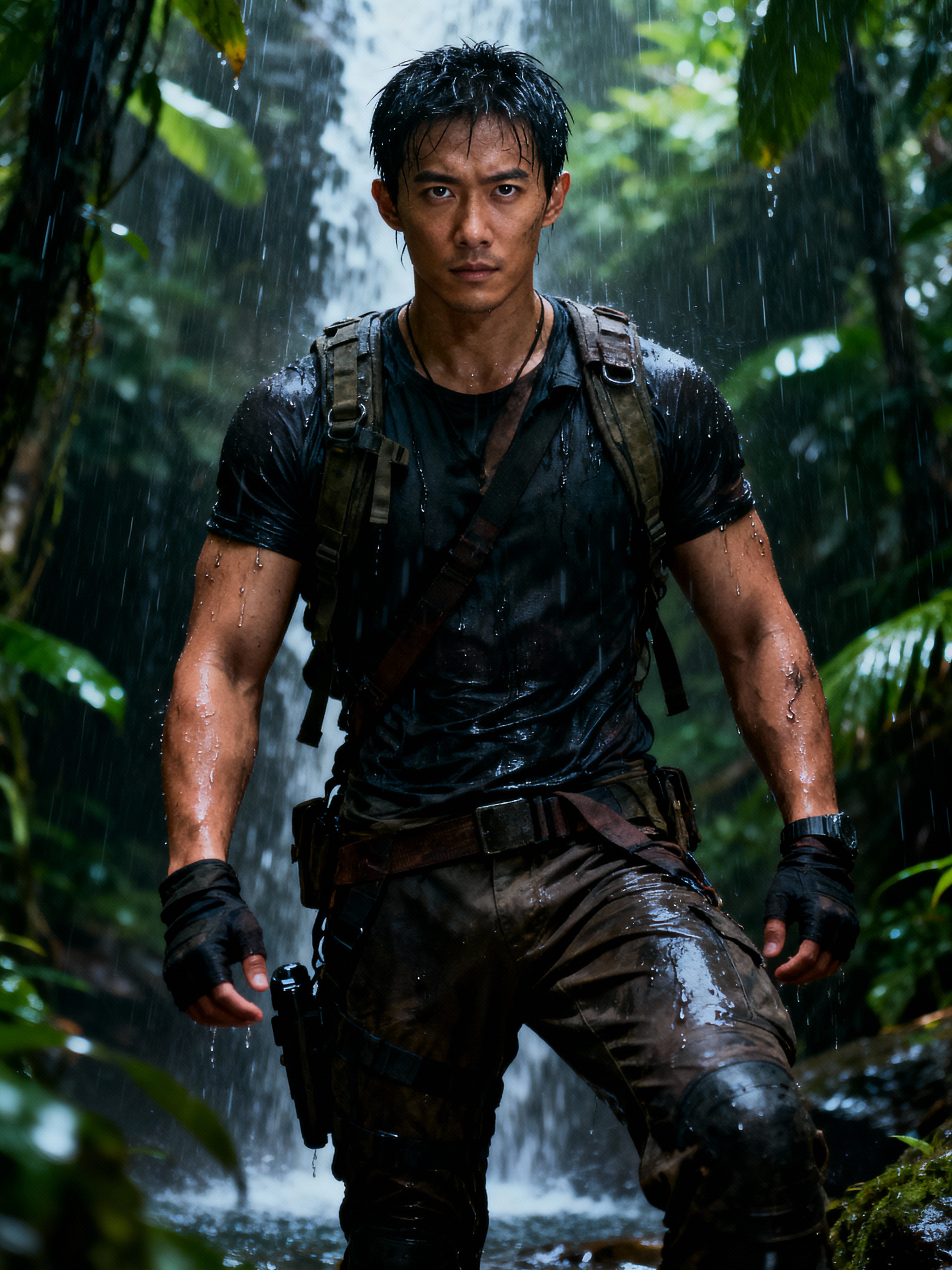model as masculine male sidekick of Lara Croft in Tombraider, in rainforest, cinematic lighting