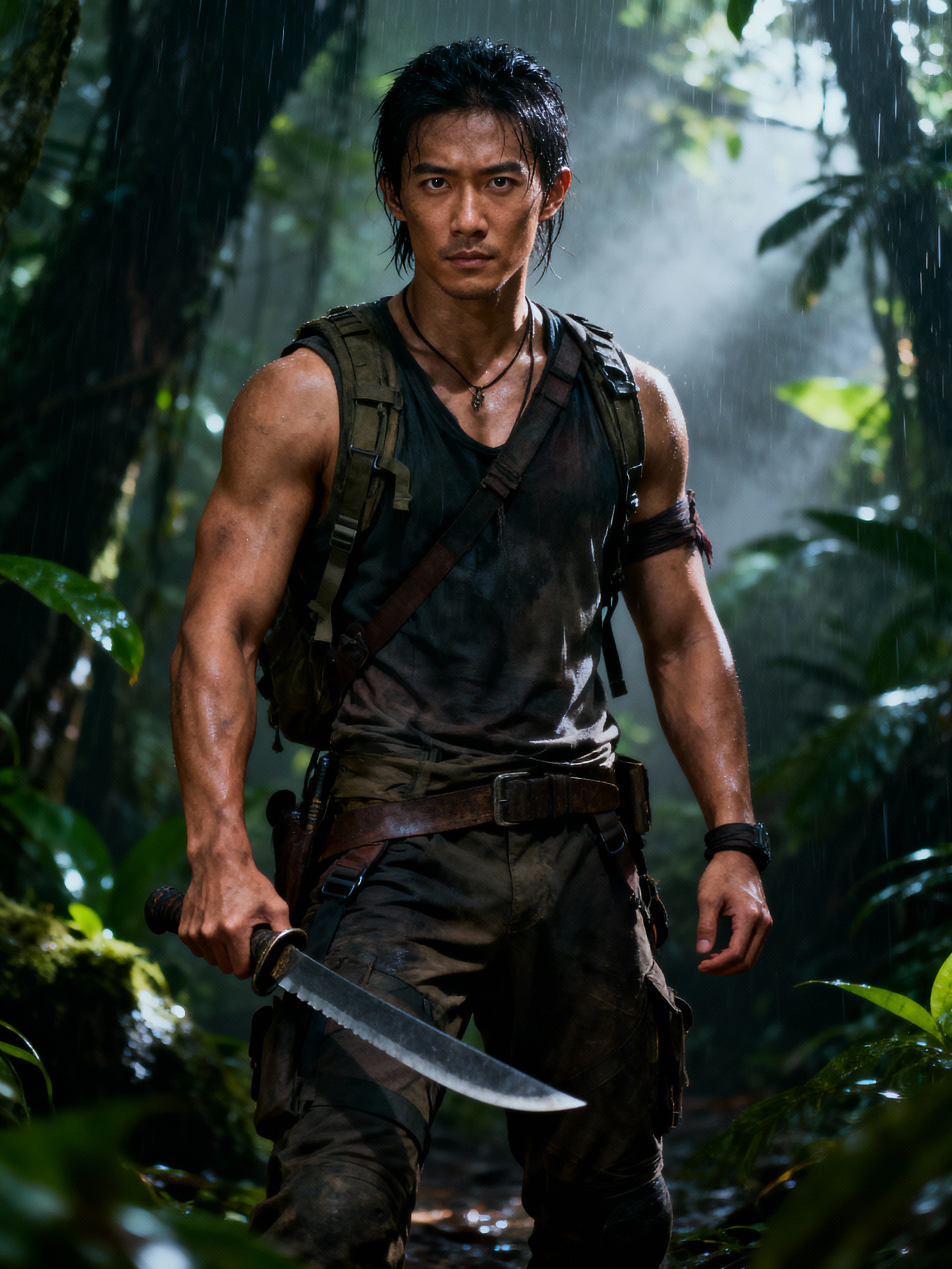 model as masculine male sidekick of Lara Croft in Tombraider, in rainforest, cinematic lighting