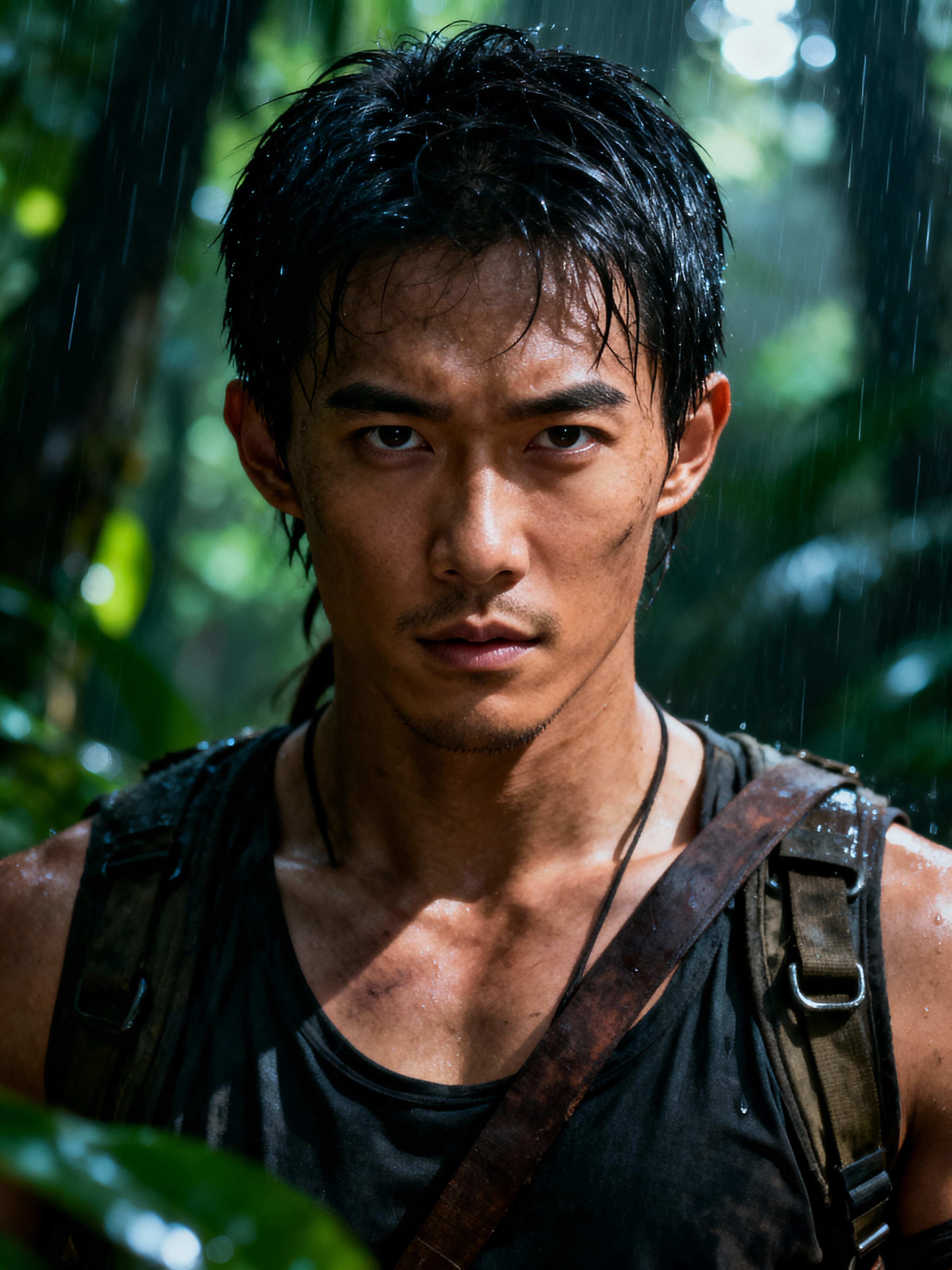 model as masculine male sidekick of Lara Croft in Tombraider, in rainforest, cinematic lighting