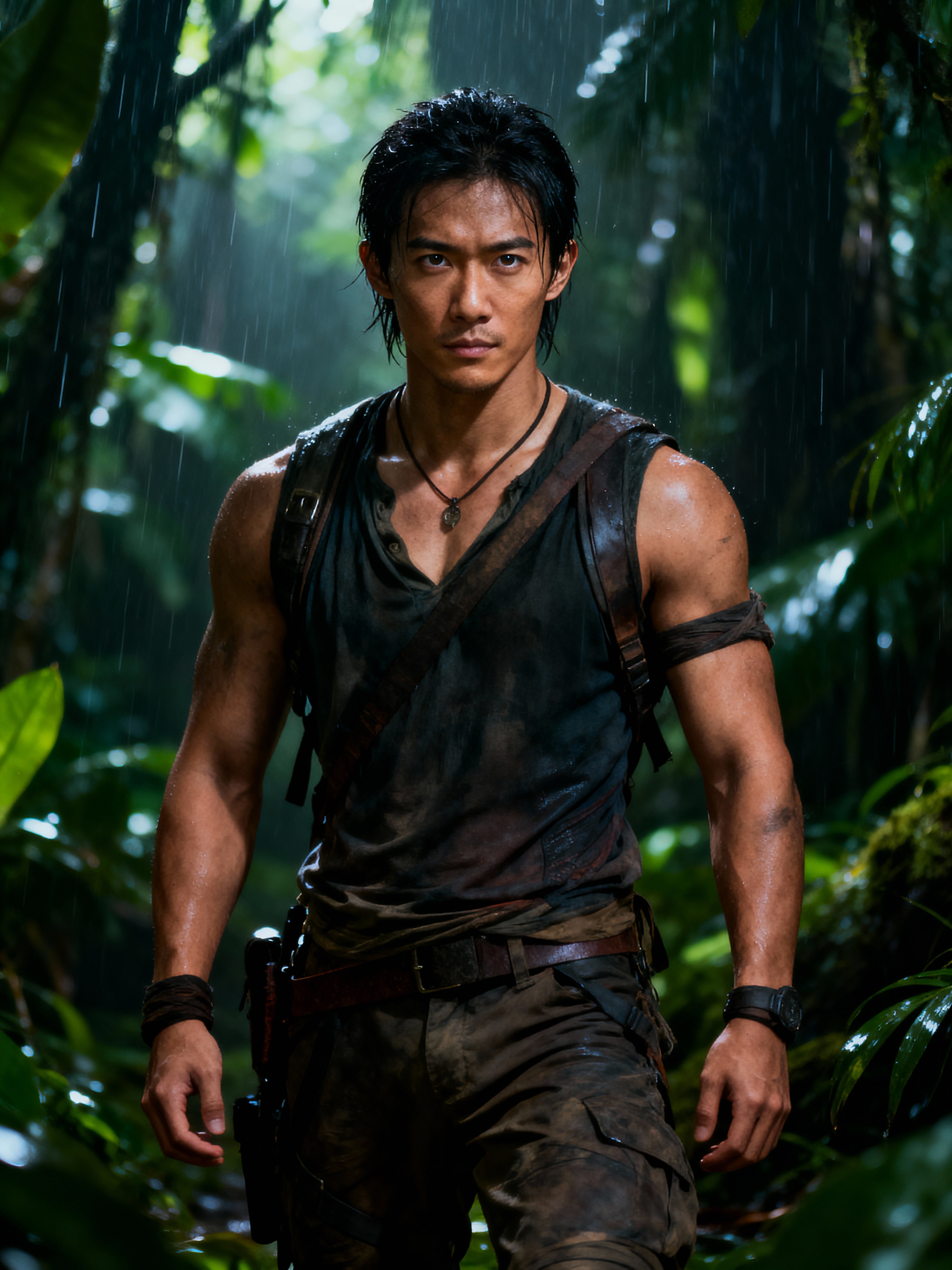 model as masculine male sidekick of Lara Croft in Tombraider, in rainforest, cinematic lighting