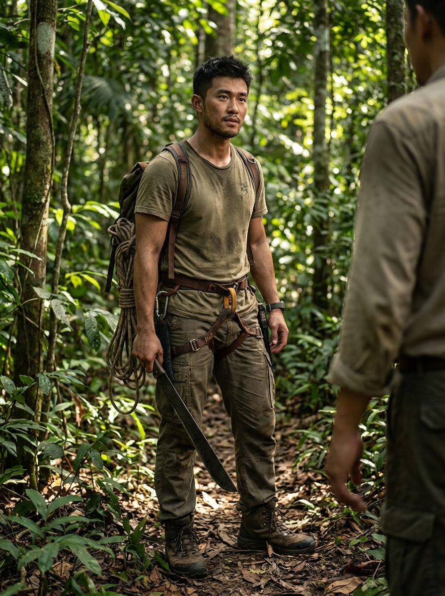 model as masculine male sidekick of Lara Croft in Tombraider, in rainforest, cinematic lighting