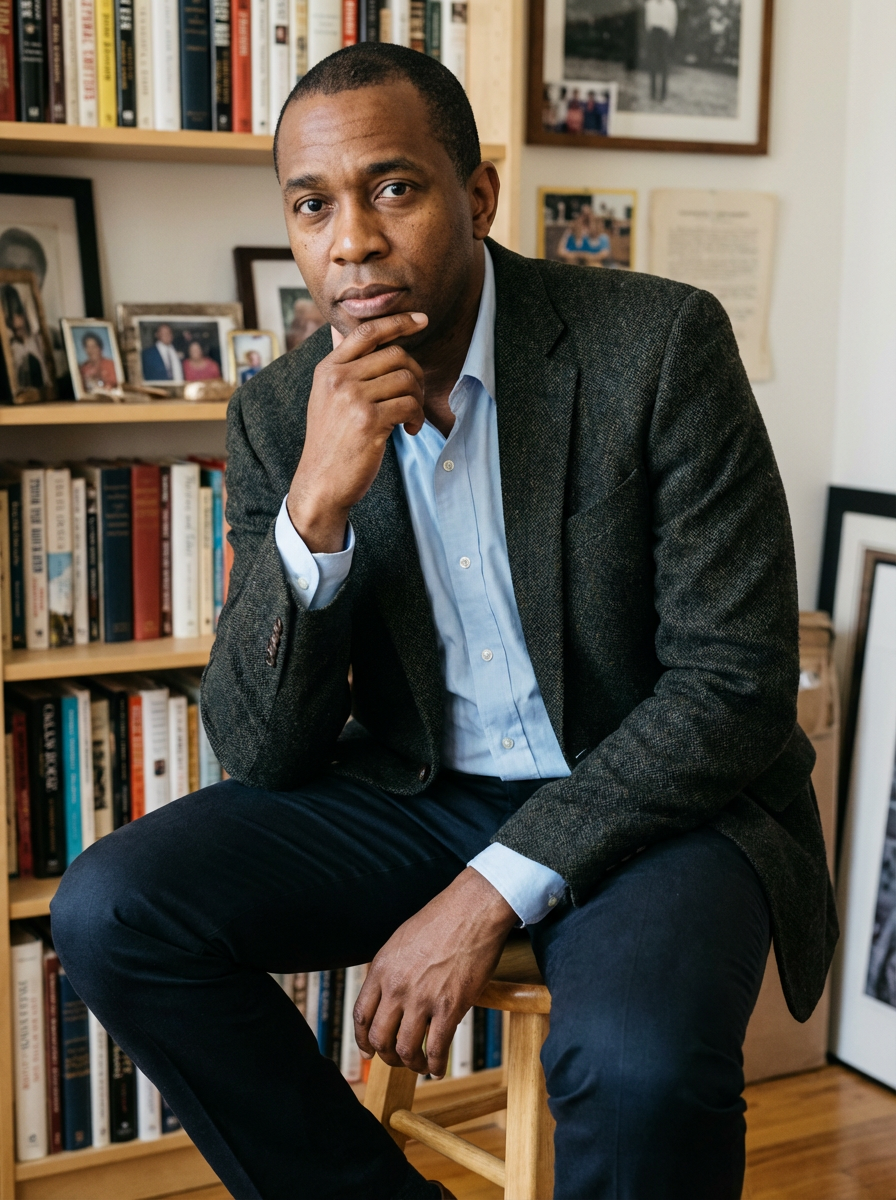 model as memoir author photo, thoughtful expression, professional yet personal, elegant simple background