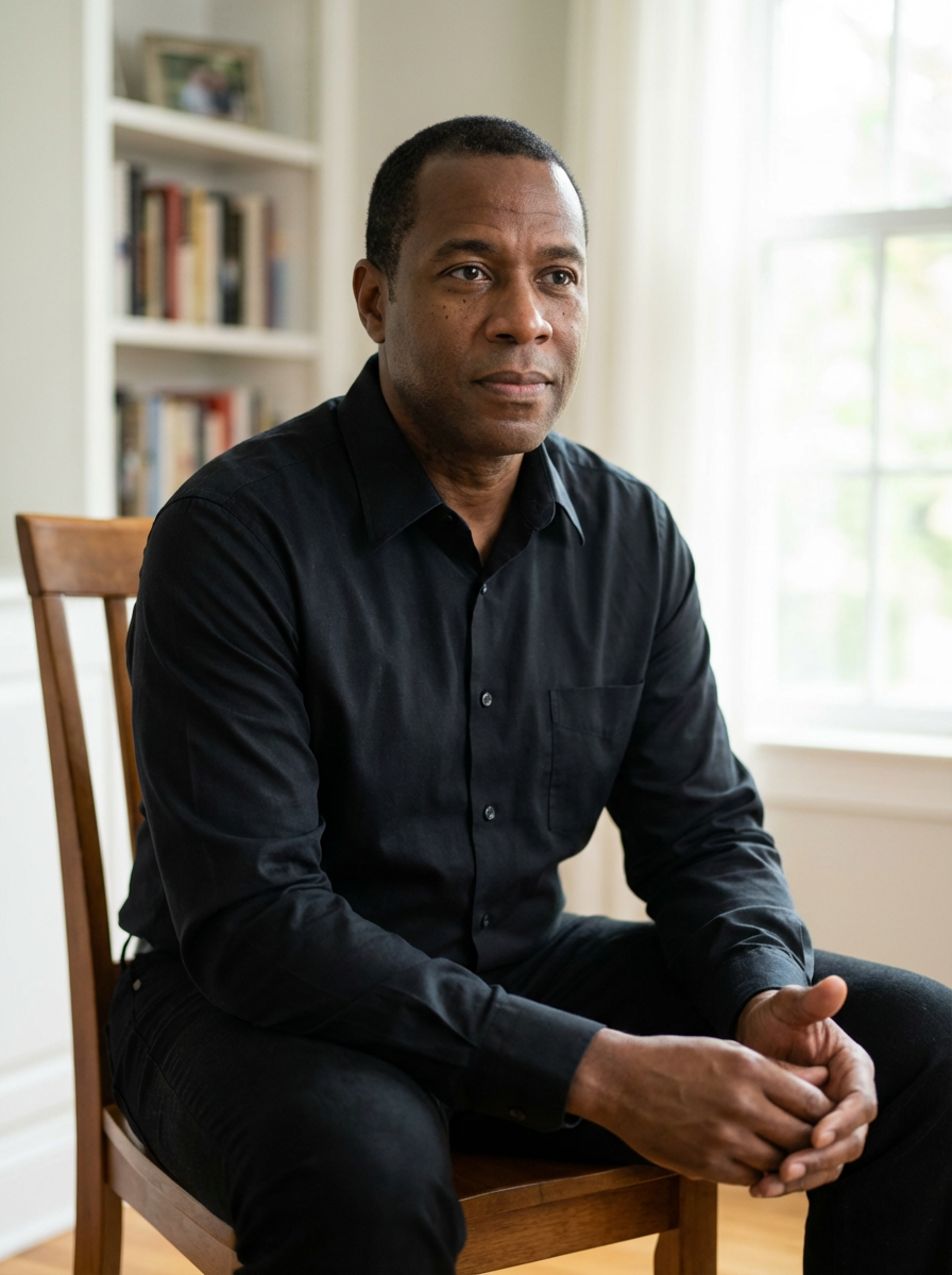 model as memoir author photo, thoughtful expression, professional yet personal, elegant simple background