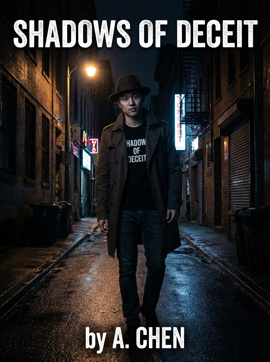 model as mystery novel cover, detective noir aesthetic, shadowy lighting, intriguing expression