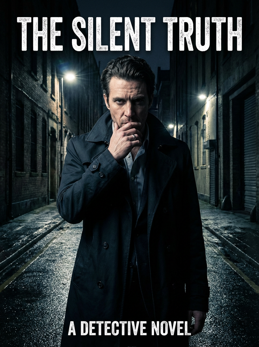 model as mystery novel cover, detective noir aesthetic, shadowy lighting, intriguing expression