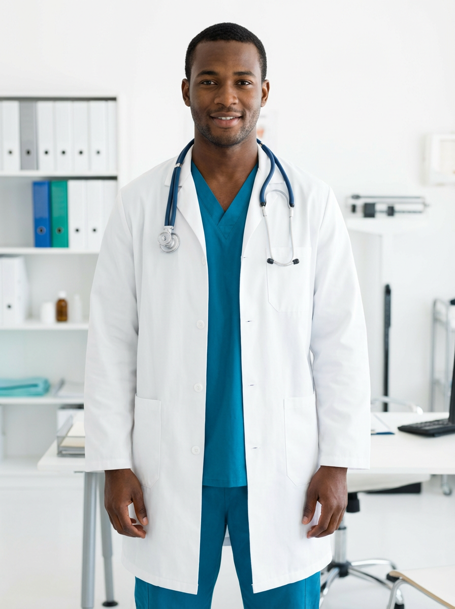 model as nurse in white lab coat over scrubs, stethoscope around neck, confident caring expression, medical office background