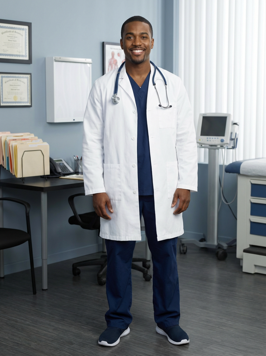 model as nurse in white lab coat over scrubs, stethoscope around neck, confident caring expression, medical office background