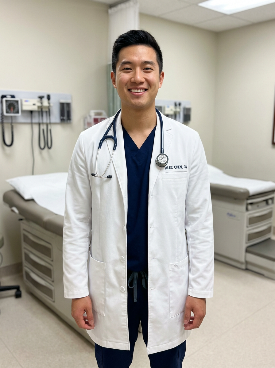 model as nurse in white lab coat over scrubs, stethoscope around neck, confident caring expression, medical office background