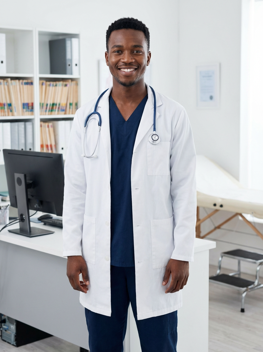 model as nurse in white lab coat over scrubs, stethoscope around neck, confident caring expression, medical office background