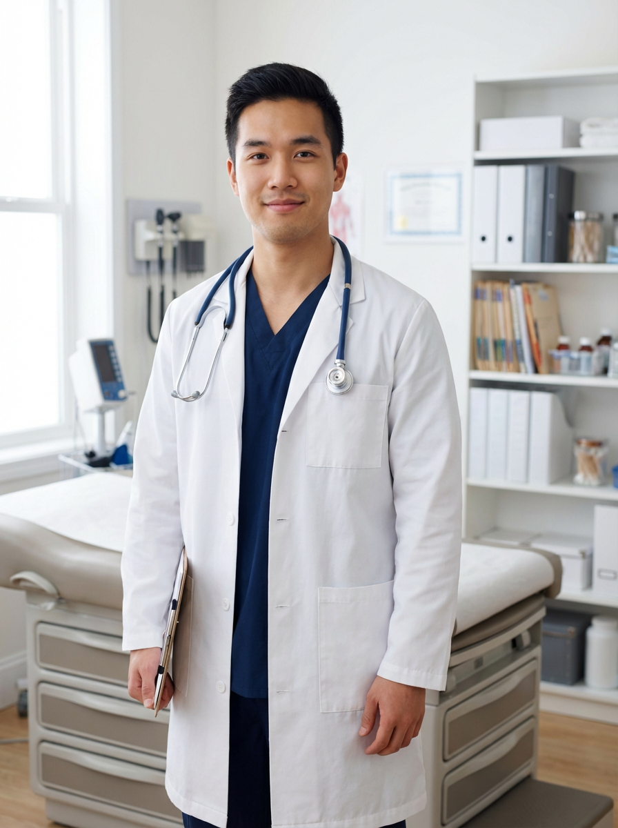 model as nurse in white lab coat over scrubs, stethoscope around neck, confident caring expression, medical office background