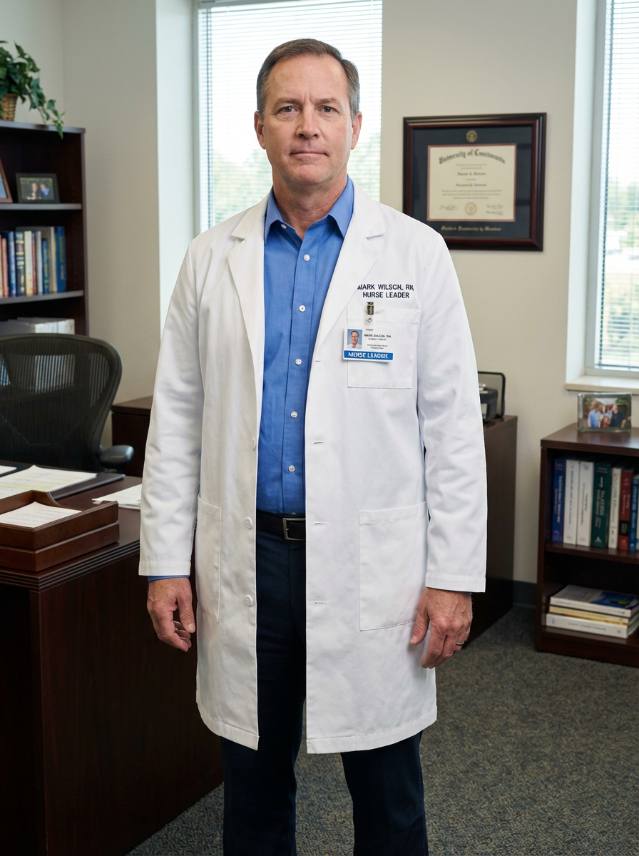 model as nurse leader, business casual with lab coat, authoritative yet approachable, office setting