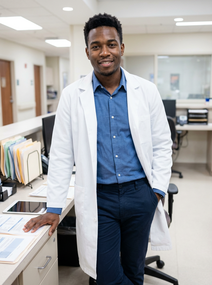 model as nurse leader, business casual with lab coat, authoritative yet approachable, office setting
