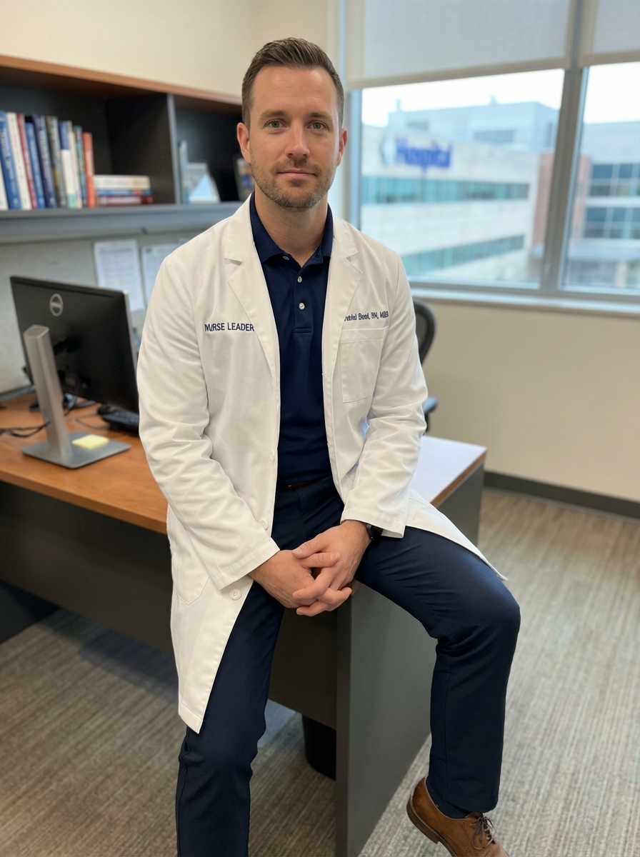 model as nurse leader, business casual with lab coat, authoritative yet approachable, office setting