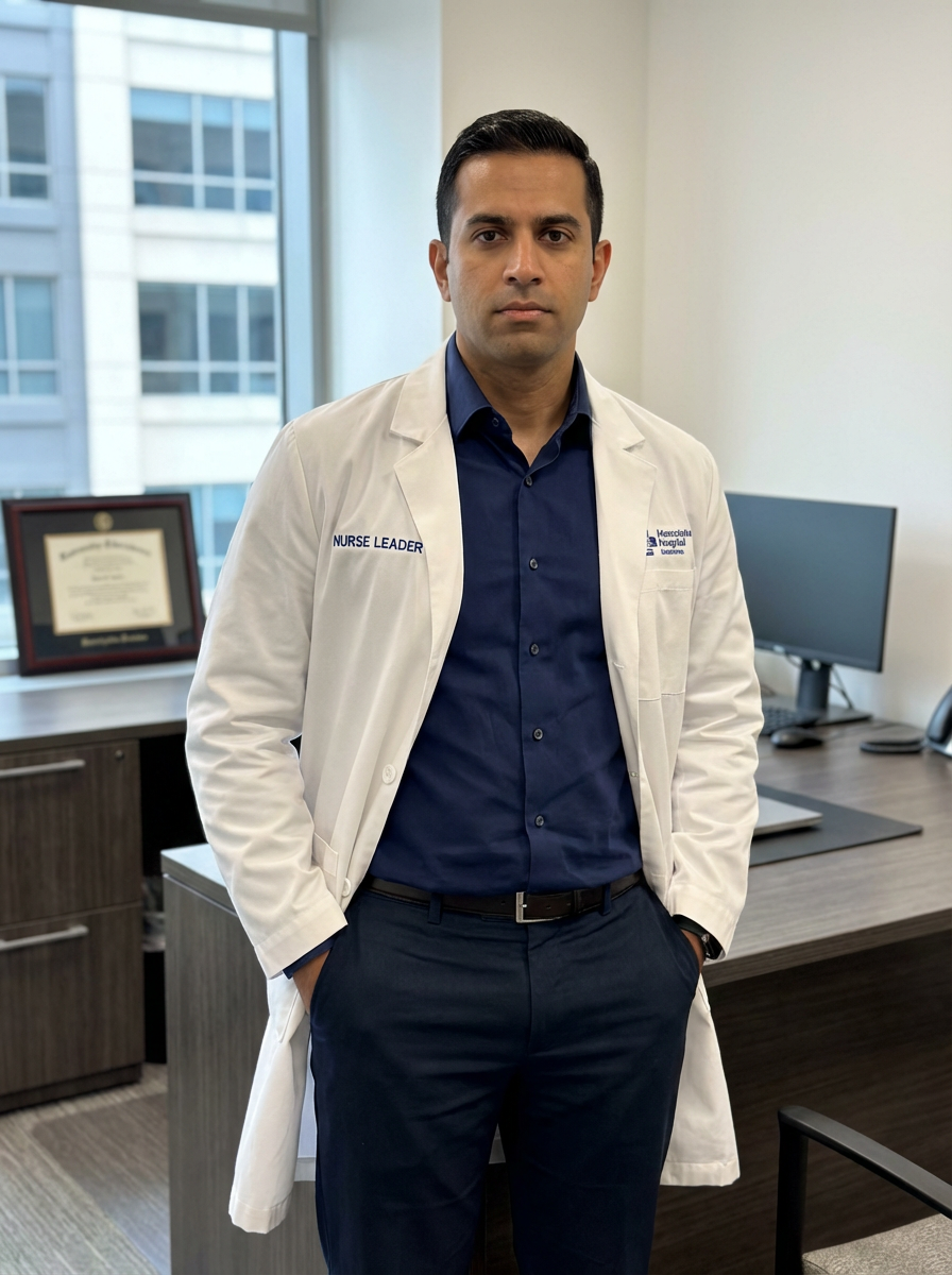 model as nurse leader, business casual with lab coat, authoritative yet approachable, office setting