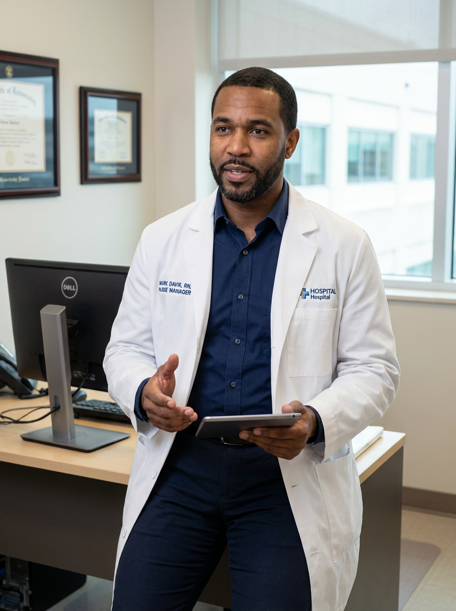 model as nurse leader, business casual with lab coat, authoritative yet approachable, office setting