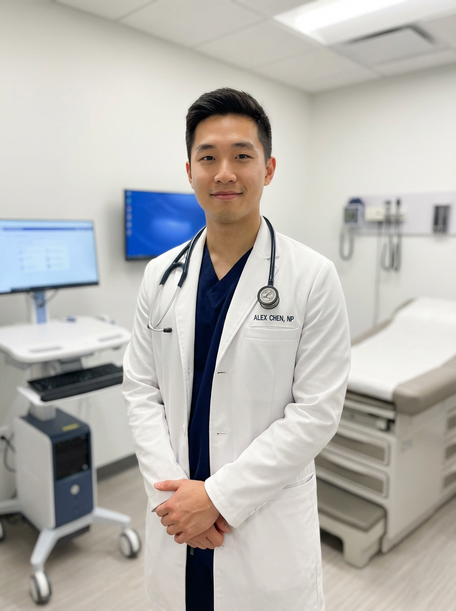 model as nurse practitioner, white coat, professional demeanor, modern medical office, competent caring look