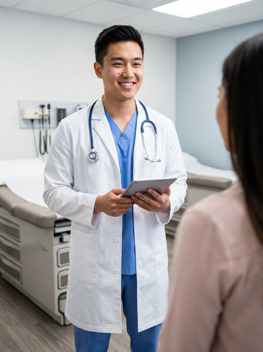 model as nurse practitioner, white coat, professional demeanor, modern medical office, competent caring look