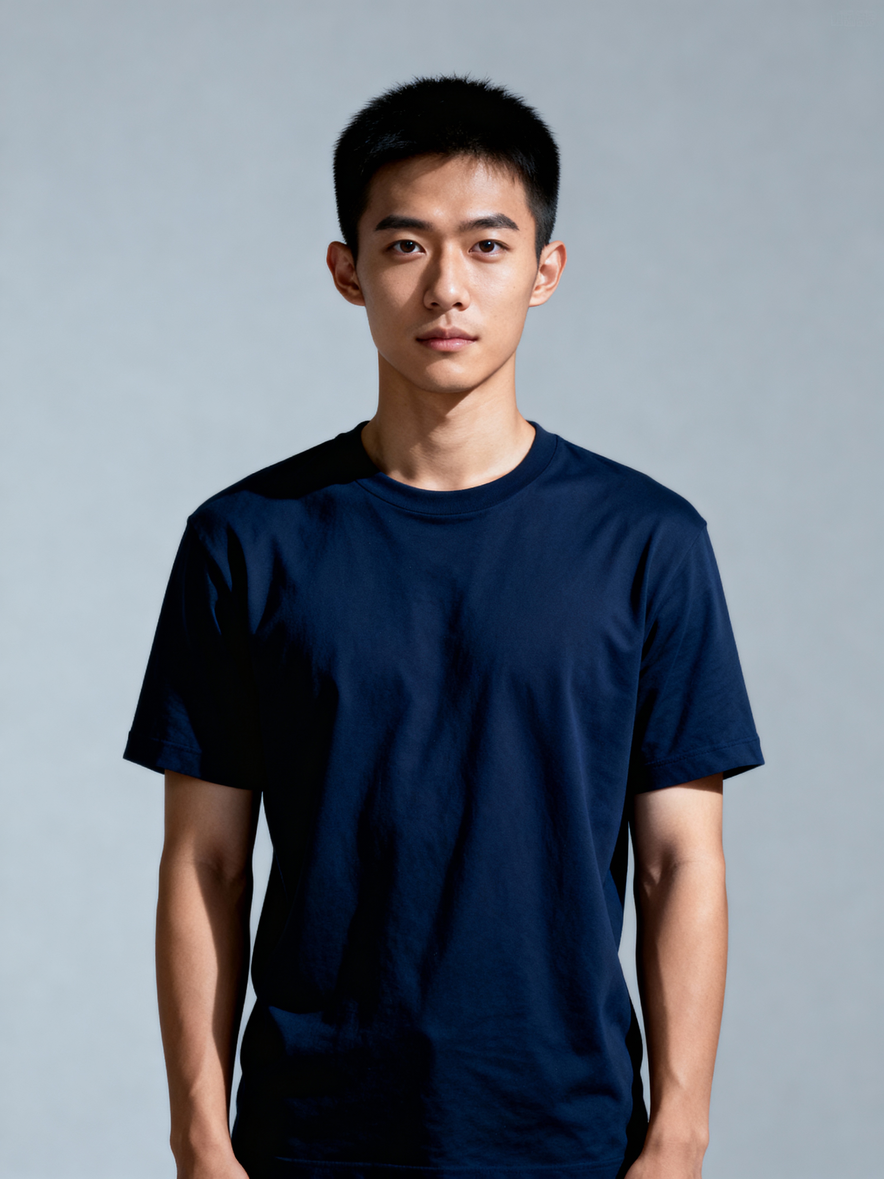 model as official passport photo for government documents. wearing a dark blue navy t-shirt. photorealistic. light gray background. entire face visible. entire head visible