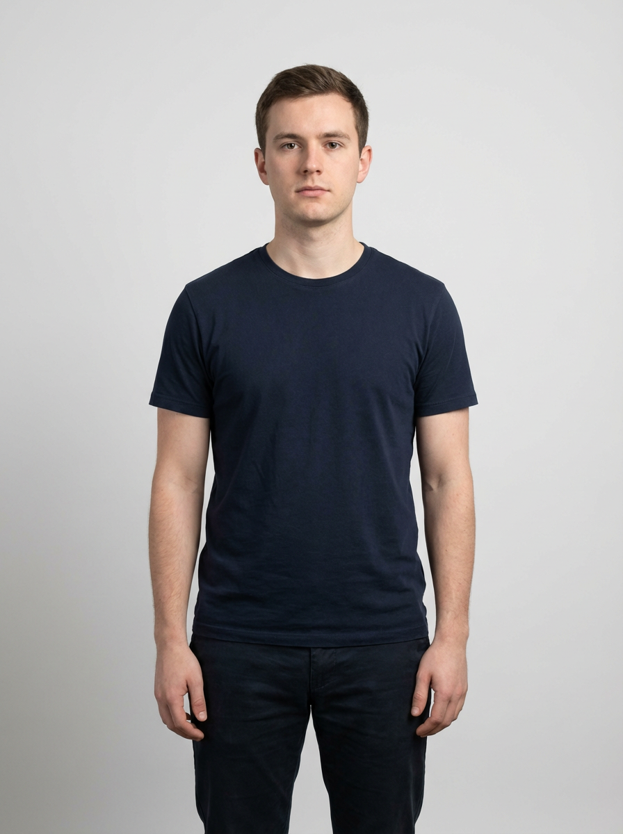 model as official passport photo for government documents. wearing a dark blue navy t-shirt. photorealistic. light gray background. entire face visible. entire head visible