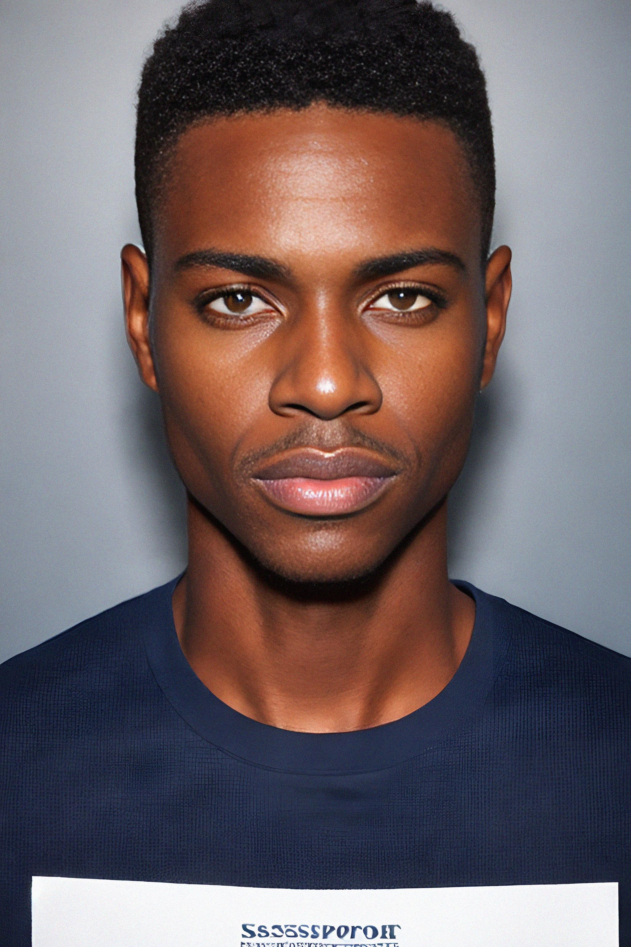 model as official passport photo for government documents. wearing a dark blue navy t-shirt. photorealistic. light gray background. entire face visible. entire head visible
