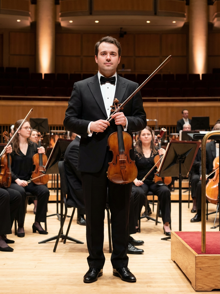 model as orchestra musician, formal black attire, refined classical presence, symphony hall setting