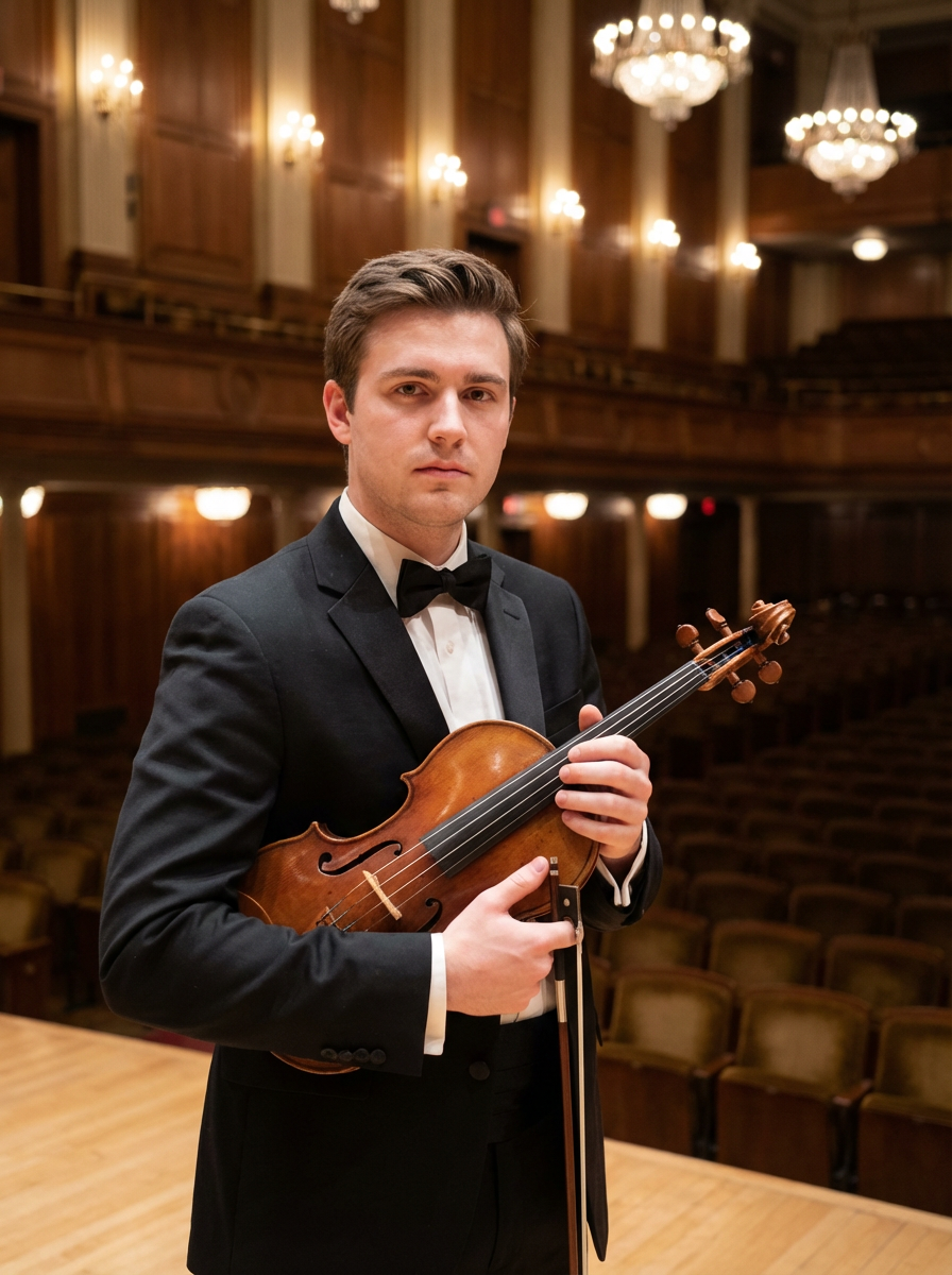 model as orchestra musician, formal black attire, refined classical presence, symphony hall setting