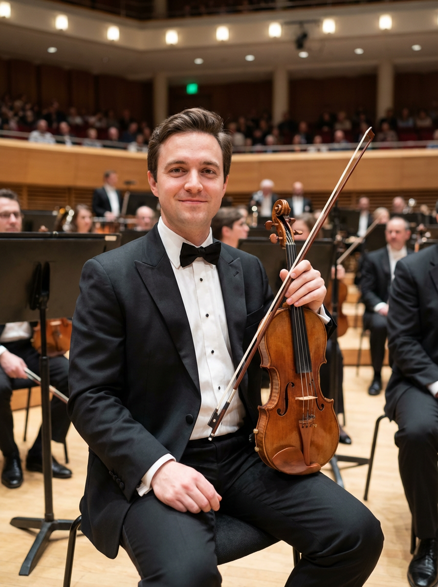model as orchestra musician, formal black attire, refined classical presence, symphony hall setting