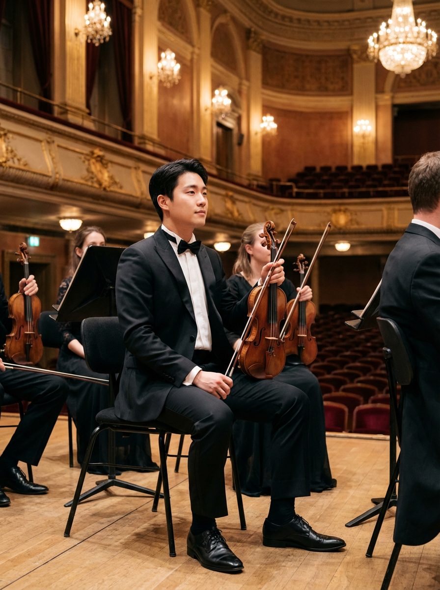 model as orchestra musician, formal black attire, refined classical presence, symphony hall setting
