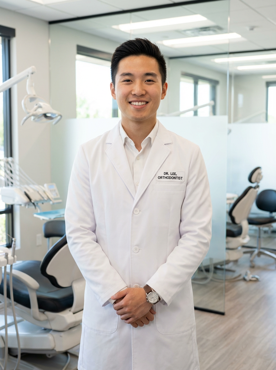 model as orthodontist, professional white coat, friendly approachable smile, modern orthodontic office