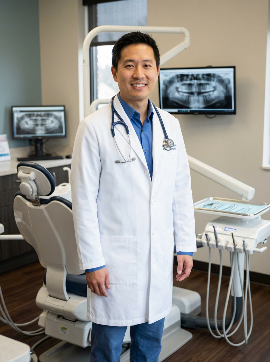 model as orthodontist, professional white coat, friendly approachable smile, modern orthodontic office