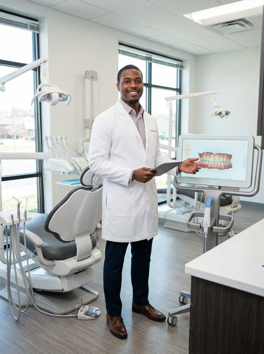 model as orthodontist, professional white coat, friendly approachable smile, modern orthodontic office