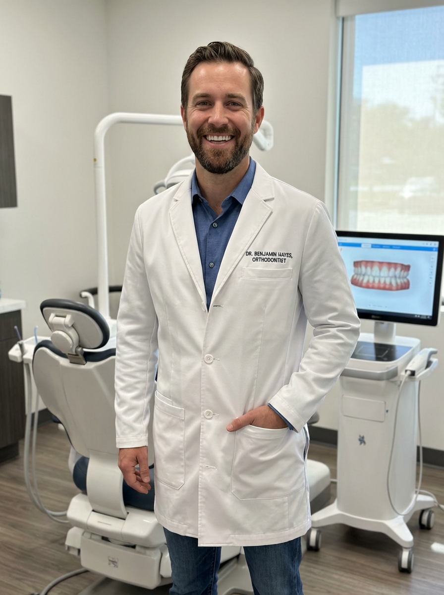 model as orthodontist, professional white coat, friendly approachable smile, modern orthodontic office