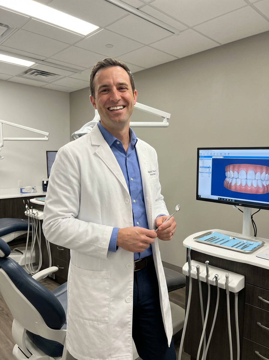 model as orthodontist, professional white coat, friendly approachable smile, modern orthodontic office