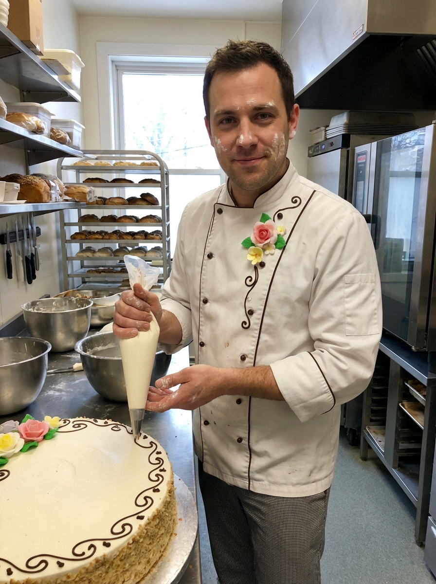 model as pastry chef, white coat with pastry decorations visible, creative artistic expression, bakery kitchen