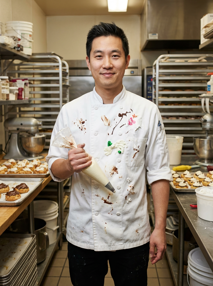 model as pastry chef, white coat with pastry decorations visible, creative artistic expression, bakery kitchen
