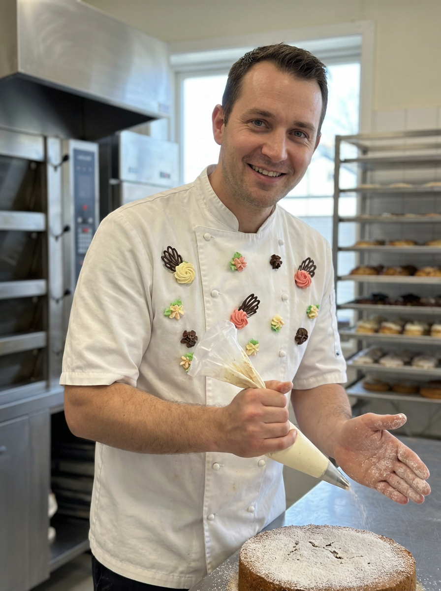 model as pastry chef, white coat with pastry decorations visible, creative artistic expression, bakery kitchen