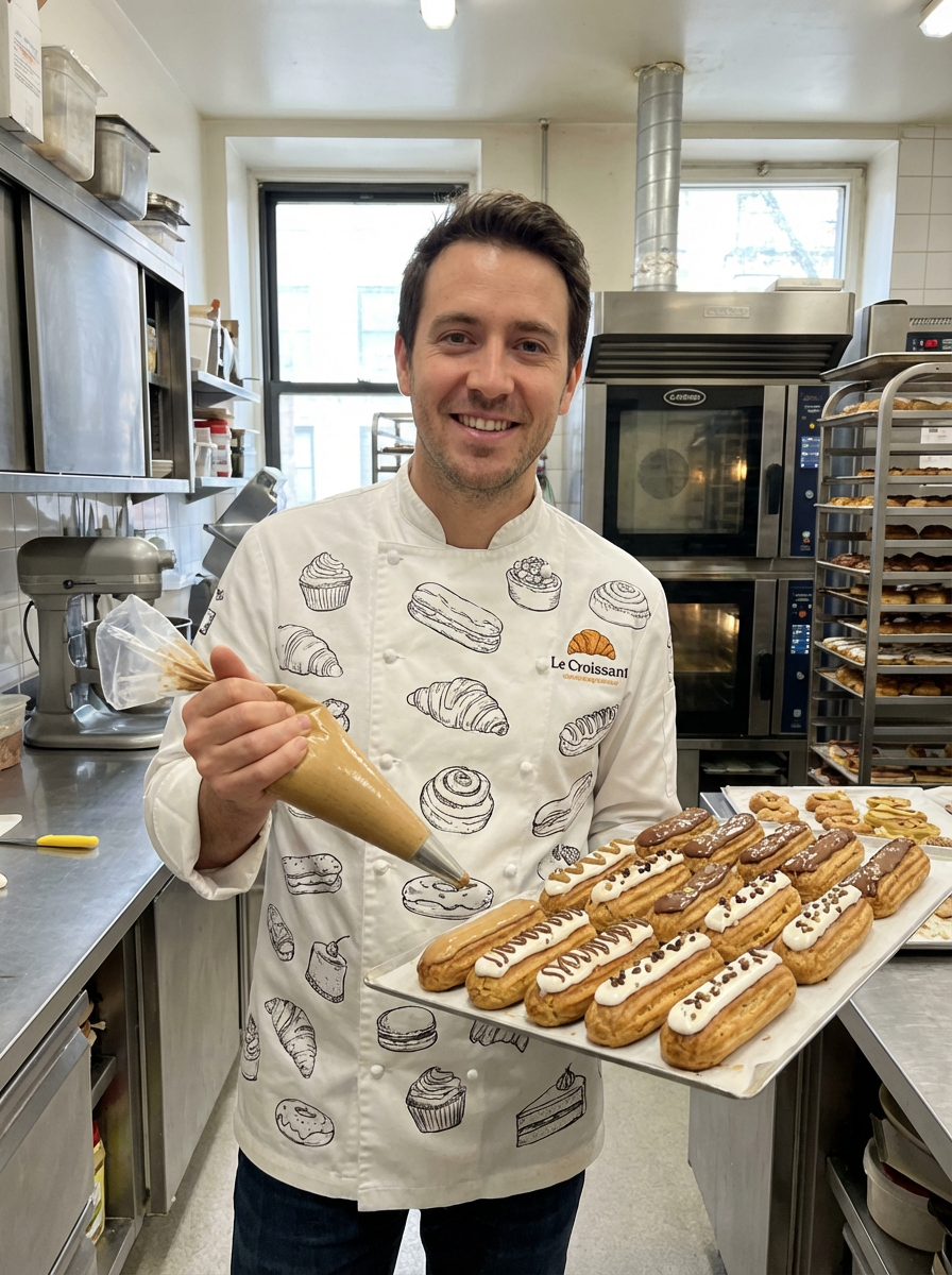 model as pastry chef, white coat with pastry decorations visible, creative artistic expression, bakery kitchen