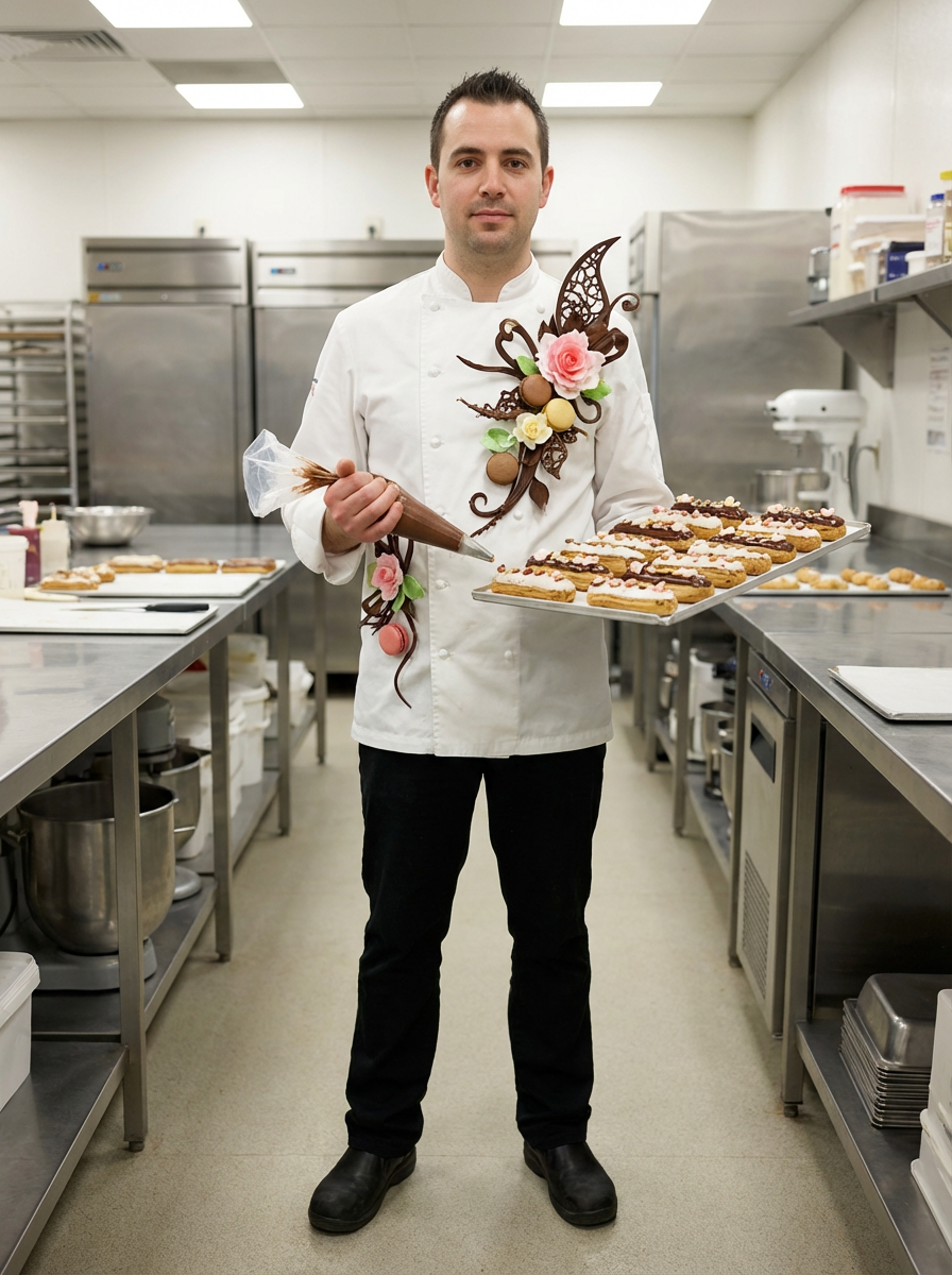 model as pastry chef, white coat with pastry decorations visible, creative artistic expression, bakery kitchen