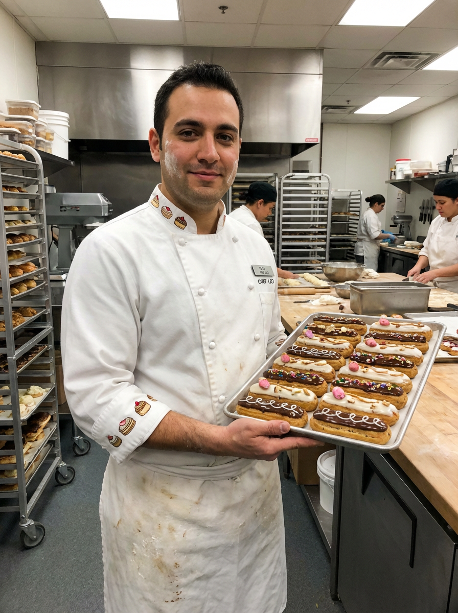 model as pastry chef, white coat with pastry decorations visible, creative artistic expression, bakery kitchen