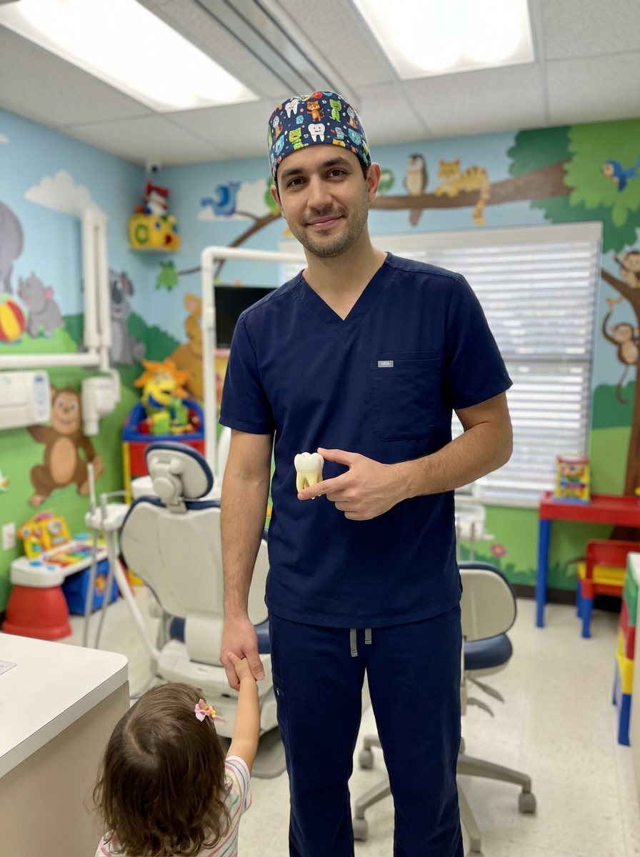 model as pediatric dentist, colorful friendly scrubs, gentle reassuring expression, child-friendly office decor