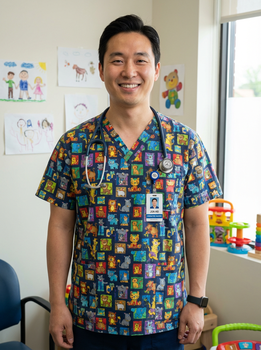 model as pediatric nurse, colorful friendly scrubs, warm inviting smile, cheerful expression