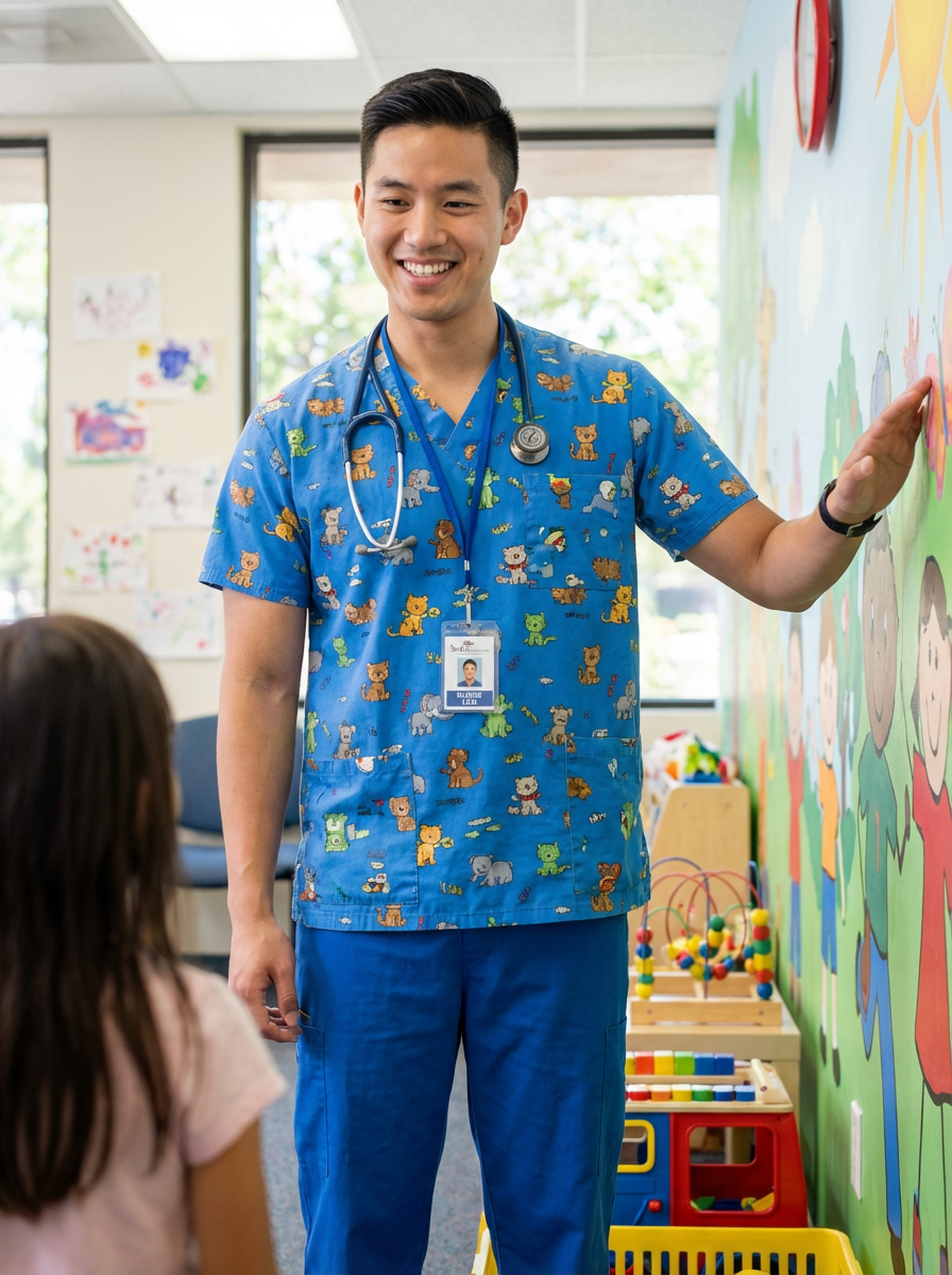 model as pediatric nurse, colorful friendly scrubs, warm inviting smile, cheerful expression