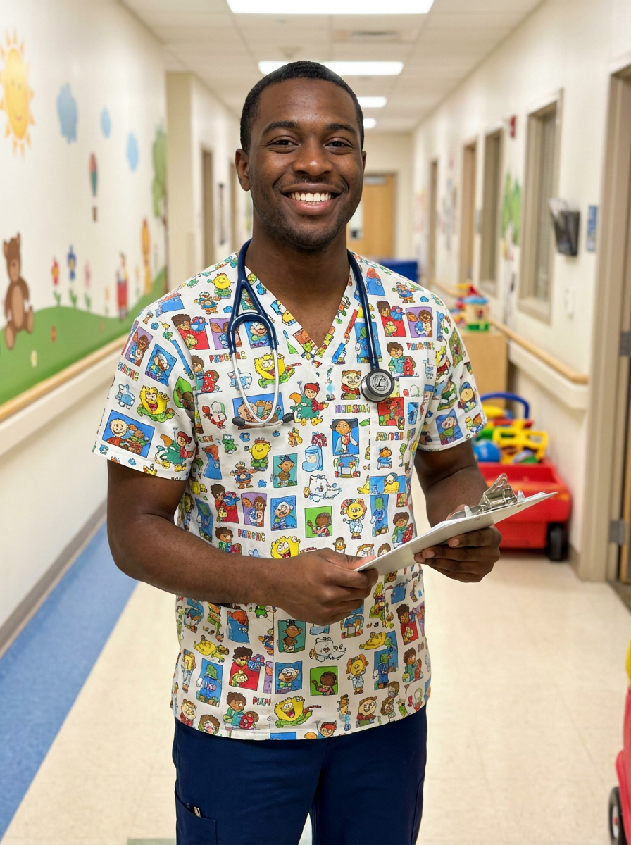 model as pediatric nurse, colorful friendly scrubs, warm inviting smile, cheerful expression