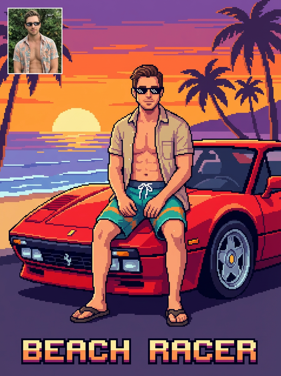model as pixel art character in 16-bit style, sitting on hood of pixelated sports car at beach, wearing pixelated board shorts, open shirt, sandals, sunglasses, sunset pixel art background, retro gaming atmosphere