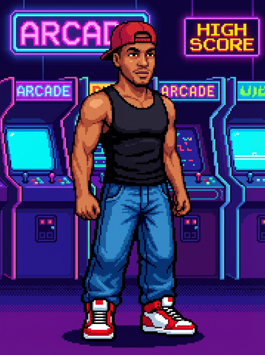 model as pixel art character in 16-bit video game style, standing confidently in front of retro arcade, wearing pixelated tank top, baggy jeans, high-top sneakers, backwards cap, vibrant neon colors, classic arcade aesthetic, pixel perfect details