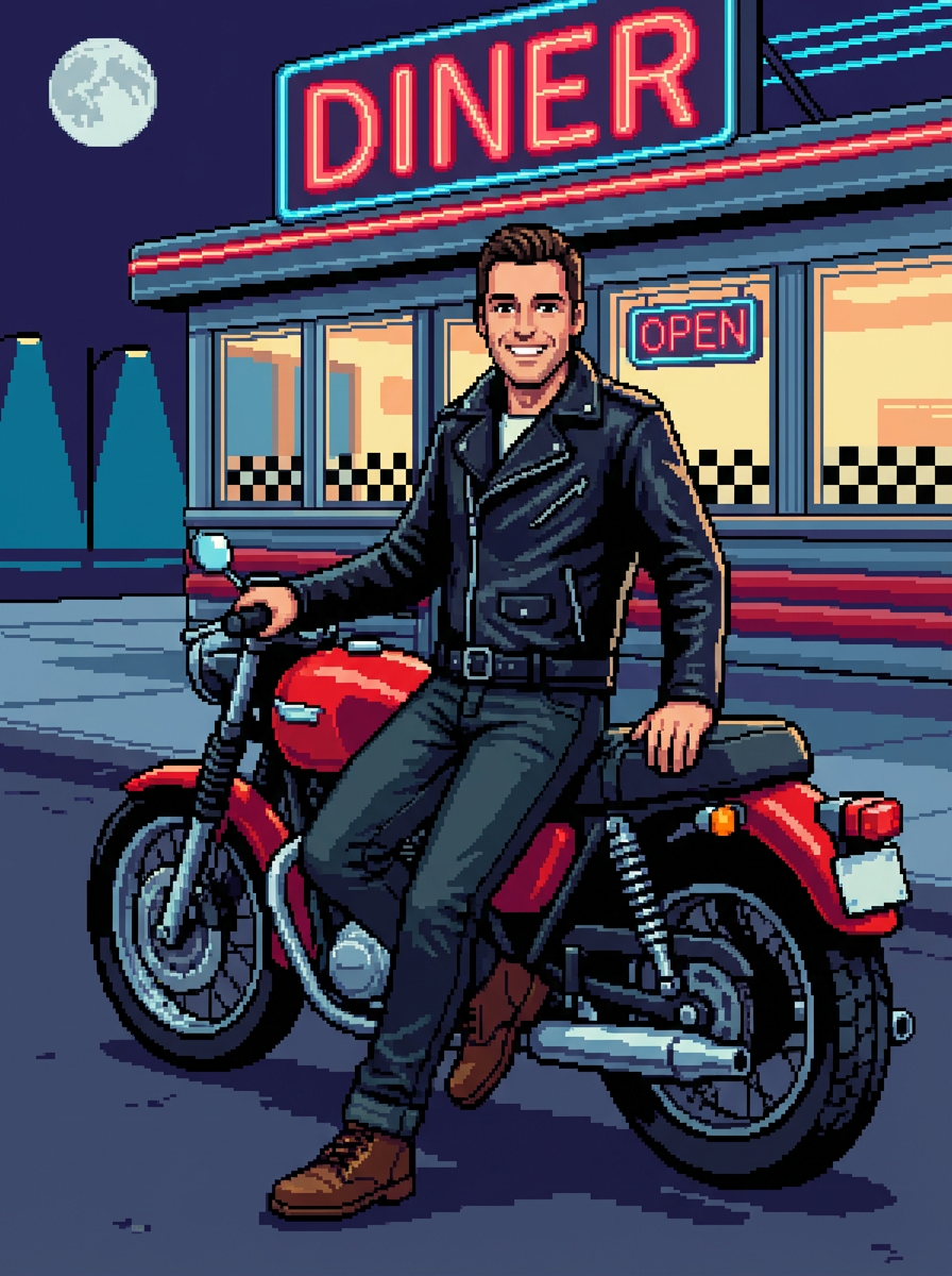 model as pixel art character in 8-bit video game style, leaning against pixelated motorcycle outside retro diner, wearing pixelated leather jacket, dark jeans, boots, classic pixel art shading, limited color palette, nostalgic gaming vibe