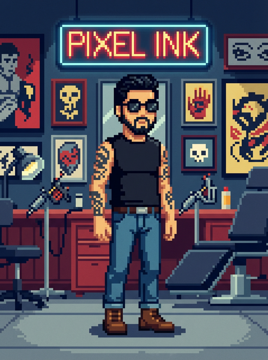 model as pixel art character in alternative pixel style, at pixelated tattoo parlor, wearing sleeveless pixel shirt showing tattoos, jeans, boots, tattoo shop pixel art, alternative culture pixel aesthetic