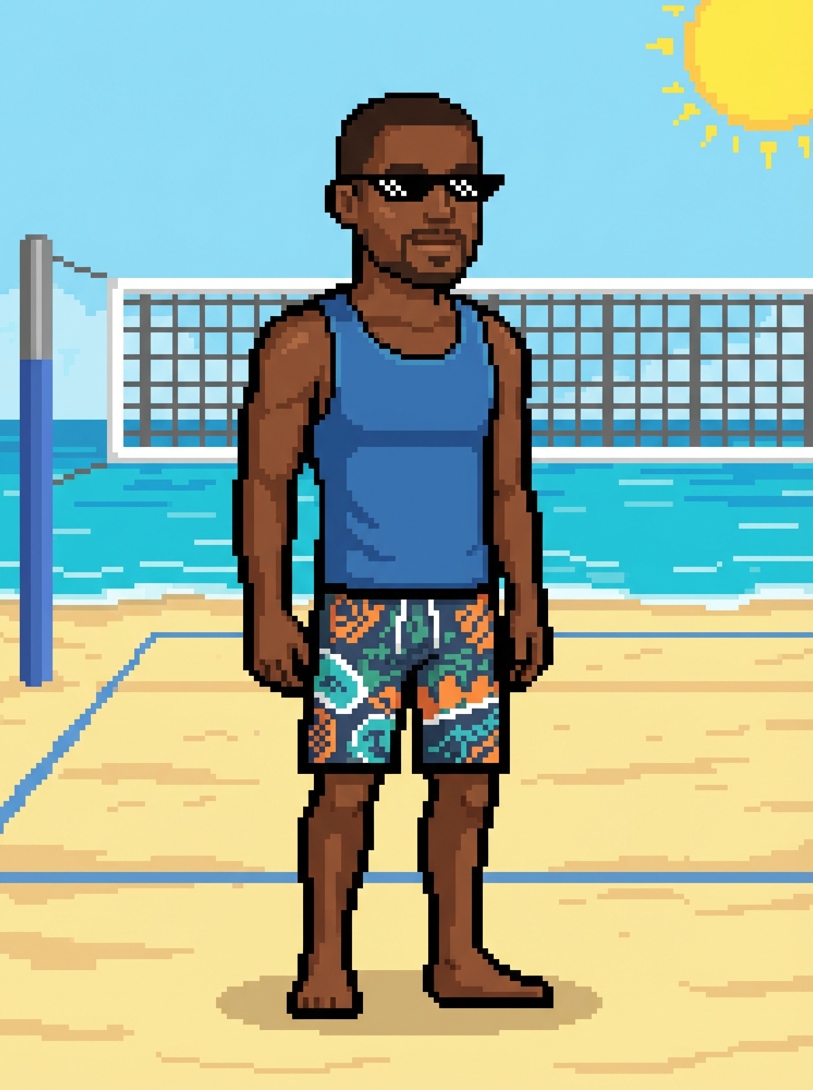 model as pixel art character in beach pixel style, at pixelated beach volleyball court, wearing board shorts, pixel tank top, sunglasses, summer beach pixel art, tropical pixel paradise